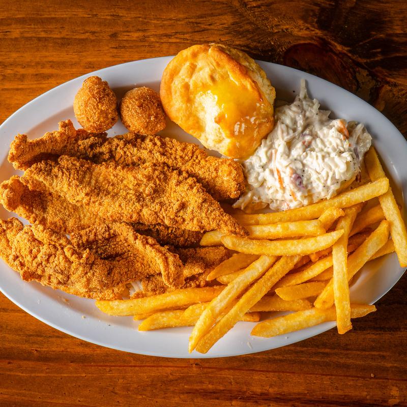 Choose 2: catfish, shrimp, or chicken tenders. coleslaw and fries