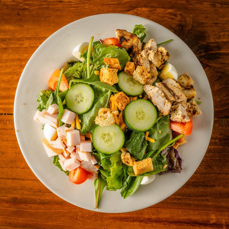Spring mix cheese, tomatoes, eggs, cucumbers, turkey, chicken, bacon and croutons