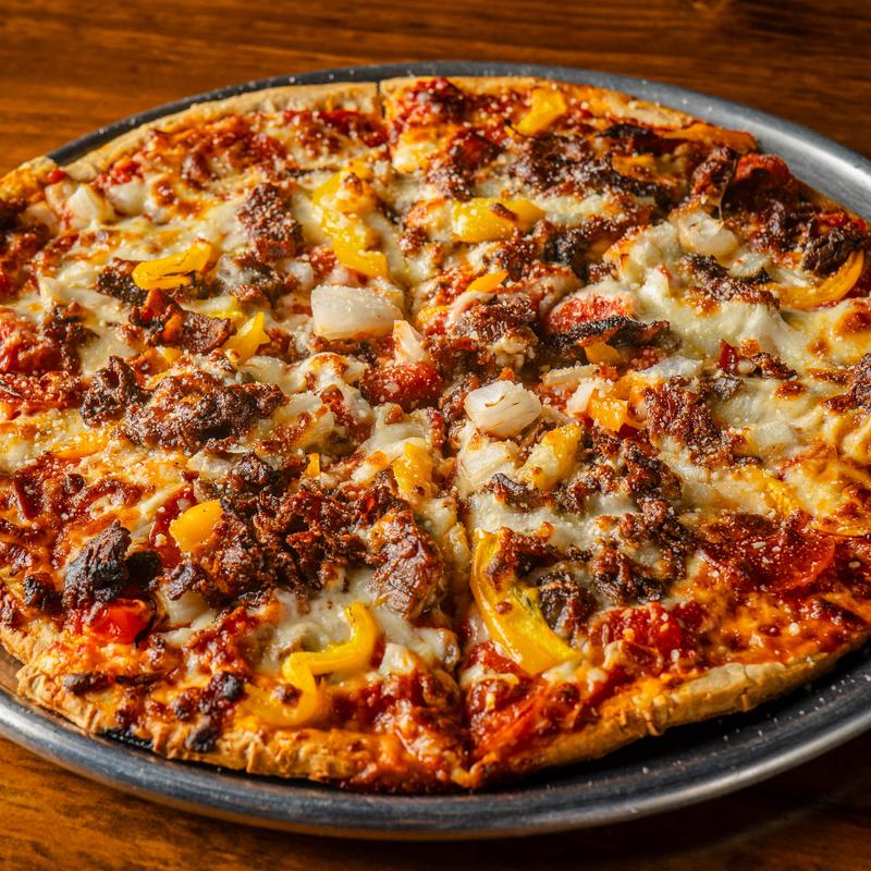 Smoked brisket, bacon, onion, cheese, pepperonis and peppers
