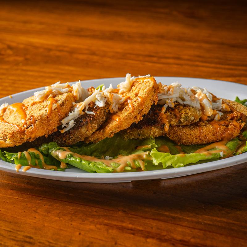Perfect combination of the southern favorites, crab cakes and fried green tomatoes topped with crab meat and in-house made sauce