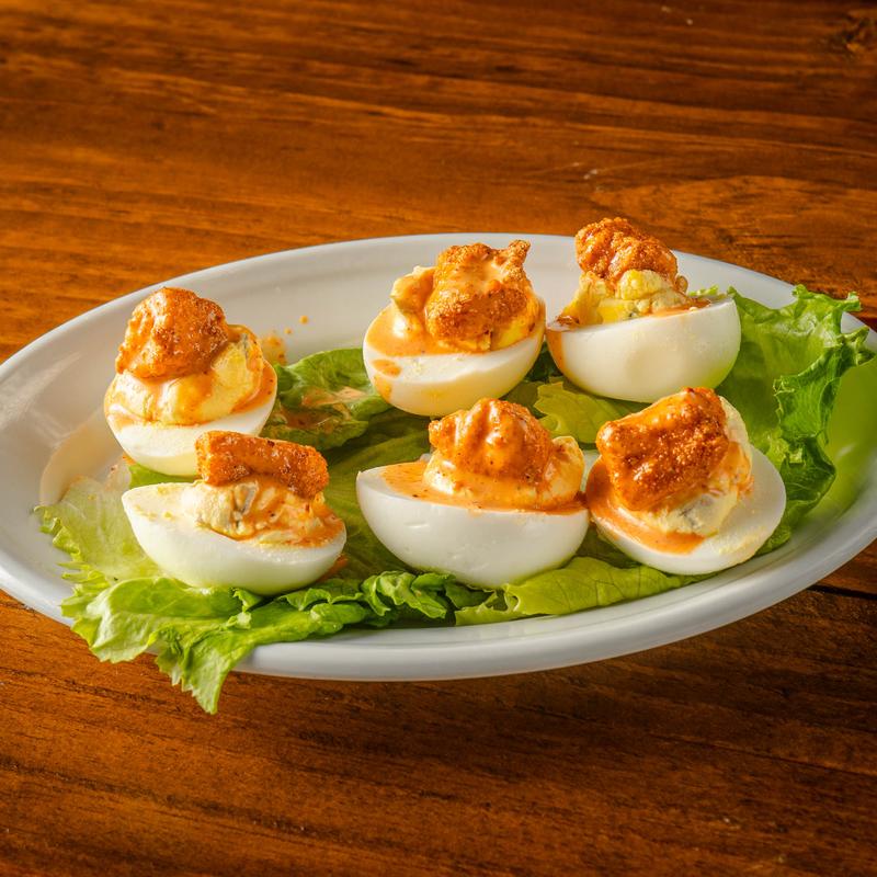 Don’t ask me how we thought of this one. This one will make you slap your momma. Deviled egg topped with a mini-fillet tossed in hot sauce | Mild or extra spicy