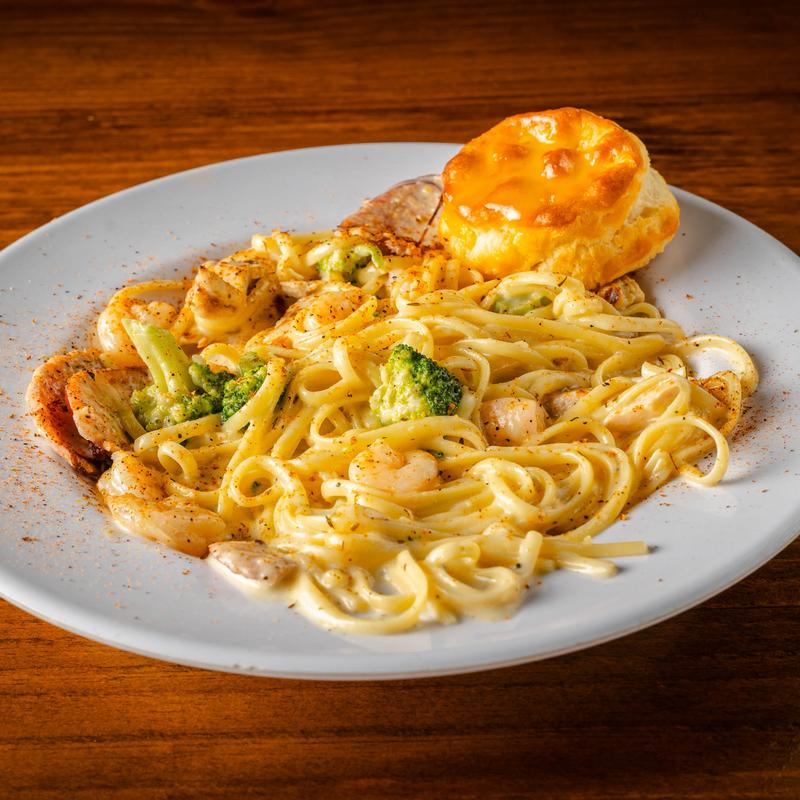 Shrimp, crawfish, fish, roasted peppers with garlic and wine over linguine noodles. This pasta has everything